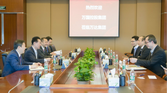 萬國控股集團董事會主席劉雅煌(右中)與萬達集團董事長王健林(左二)洽談