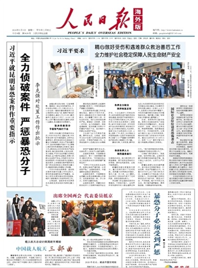 《人民日?qǐng)?bào)》頭條:劉雅煌譴責(zé)昆明事件暴徒