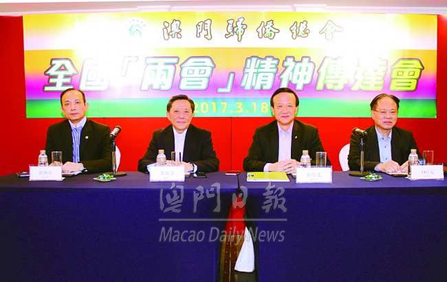 歸僑總會(huì)日前舉行全國(guó)“兩會(huì)”精神傳達(dá)會(huì),澳區(qū)全國(guó)人大代表劉藝良,以及澳區(qū)全國(guó)政協(xié)委員黎振強(qiáng)、王彬成、劉雅煌分別傳達(dá)了十二屆全國(guó)人大五次會(huì)議和全國(guó)政協(xié)十二屆五次會(huì)議主要精神,並分享了參會(huì)感受。僑總理監(jiān)事及僑界社團(tuán)代表逾百人出席。