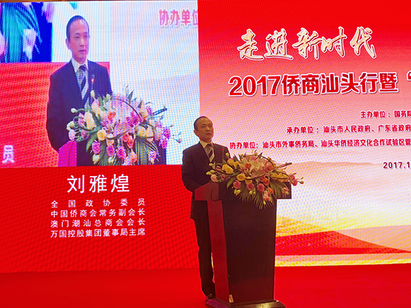 全國(guó)政協(xié)委員、萬(wàn)國(guó)控股集團(tuán)董事會(huì)主席劉雅煌為推動(dòng)汕頭“僑夢(mèng)苑”建設(shè)發(fā)表演講