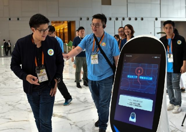 香港青年在深圳騰訊濱海大廈參觀時(shí)與機(jī)器人互動