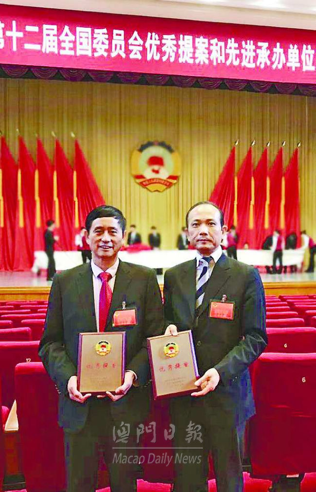 政協(xié)第十二屆全國委員會主席會議近日審定,表彰二百四十件優(yōu)秀提案。兩全國政協(xié)澳區(qū)委員包括陳明金的《關(guān)於簡化和完善跨境車輛管理的建議》、劉雅煌的《關(guān)於主流媒體應(yīng)該帶頭啟動全民科技創(chuàng)新思維的提案》獲獎。