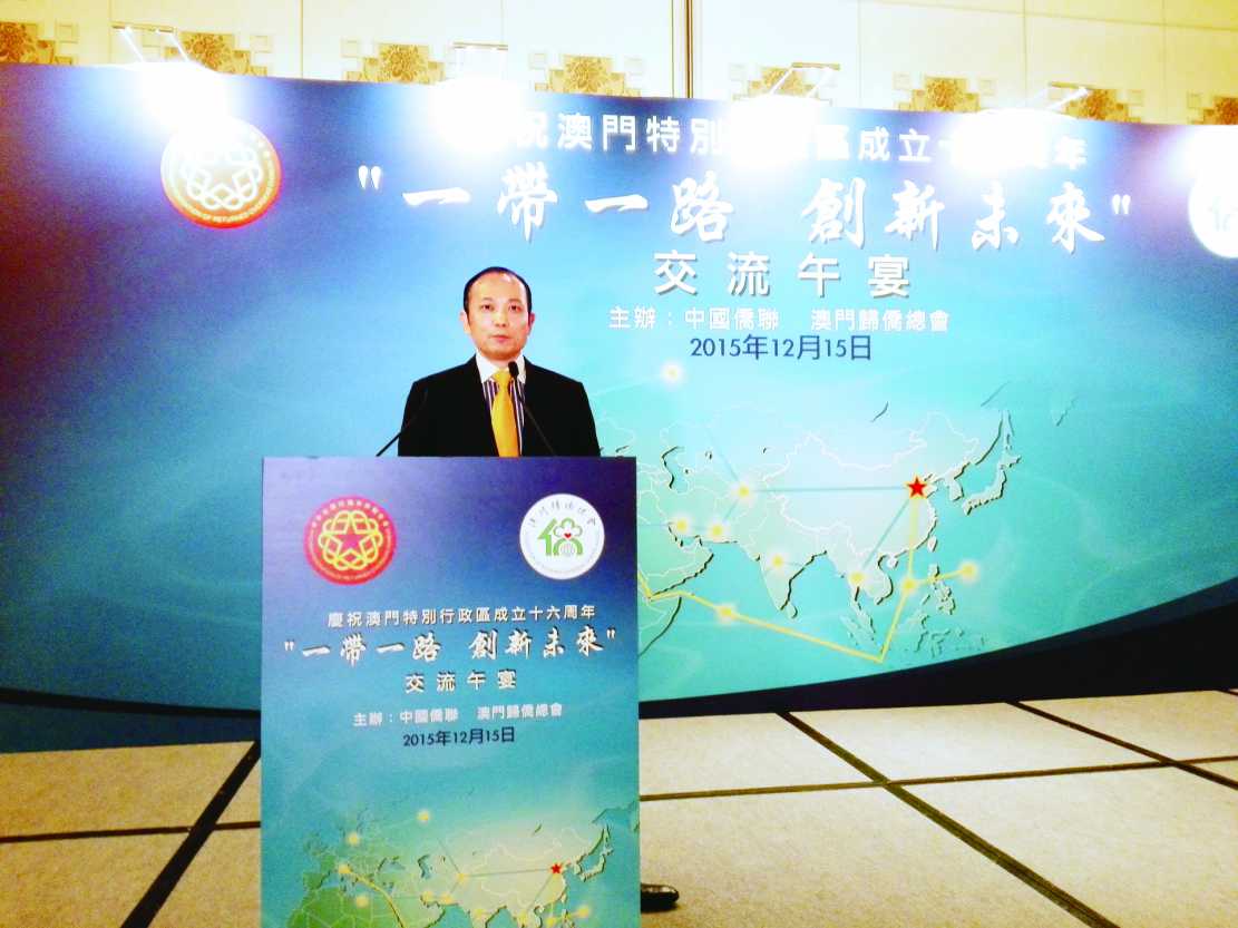 【本報(bào)訊】中國(guó)僑聯(lián)、澳門歸僑總會(huì)合辦“一帶一路 · 創(chuàng)新未來(lái)”專題講座後,即設(shè)午宴款待出席的專家和學(xué)者。全國(guó)政協(xié)委員、僑總監(jiān)事長(zhǎng)、萬(wàn)國(guó)控股集團(tuán)主席劉雅煌認(rèn)為,未來(lái)全球發(fā)展離不開(kāi)創(chuàng)新,面對(duì)複雜嚴(yán)峻的國(guó)內(nèi)外發(fā)展環(huán)境和宏觀經(jīng)濟(jì)下行壓力下,國(guó)家應(yīng)堅(jiān)持以創(chuàng)新力量驅(qū)動(dòng)發(fā)展戰(zhàn)略,大力推進(jìn)“大衆(zhòng)創(chuàng)業(yè),萬(wàn)衆(zhòng)創(chuàng)新“。