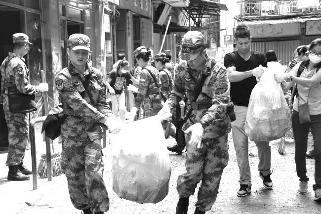 千名駐澳部隊官兵接獲指令便立刻趕往重災(zāi)區(qū)協(xié)助市民救災(zāi),經(jīng)過連續(xù)三天三夜的高效工作,解放軍已完成本澳11個區(qū)域的災(zāi)後清理任務(wù),累計面積約107.6萬平方米,運送垃圾700餘車。這些在澳門安定繁榮時不易看到的身影,卻在澳門危難之時挺身而出、義無反顧,讓市民更堅定了戰(zhàn)勝風(fēng)災(zāi)的信心。