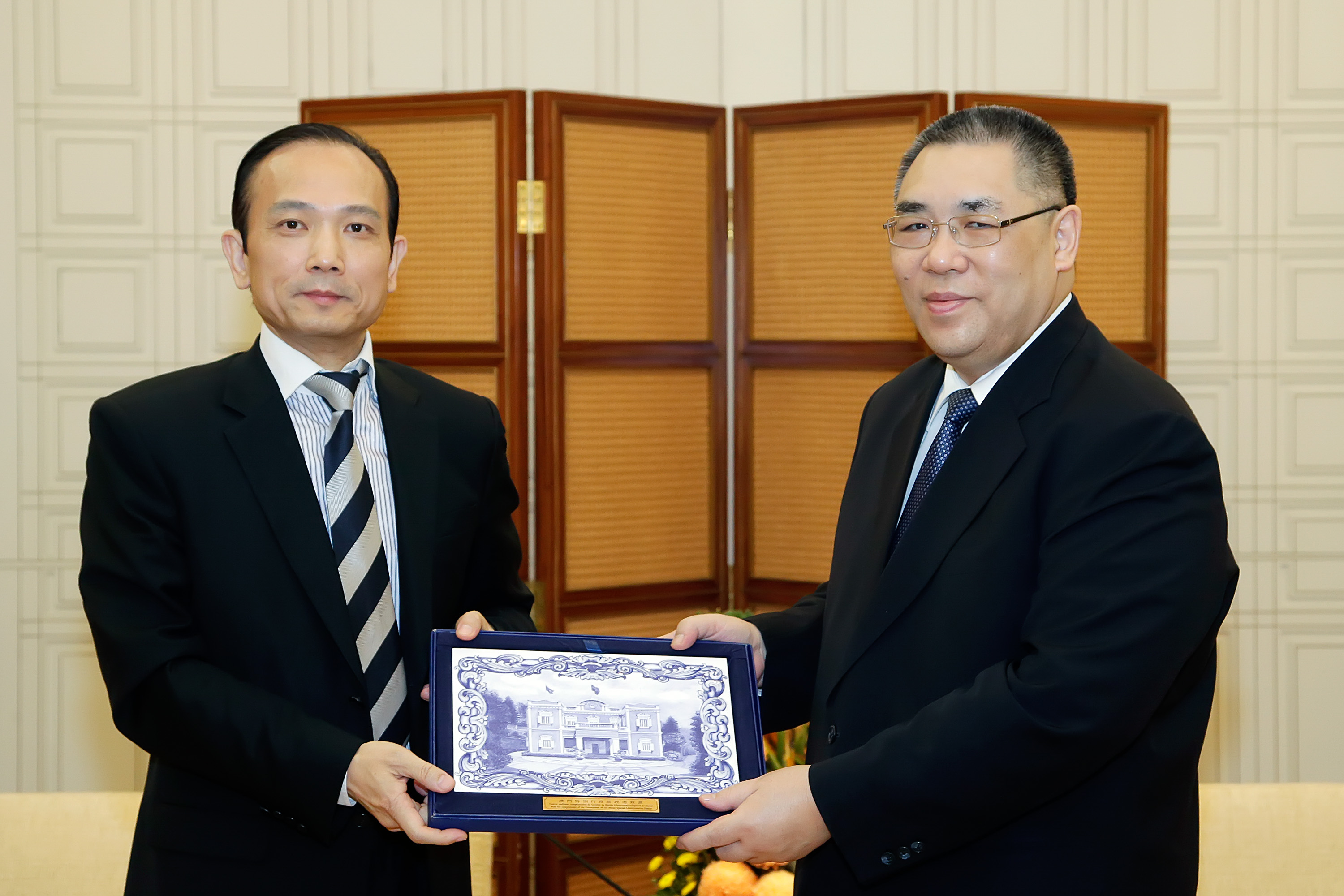 渝澳聯(lián)誼總會會長劉雅煌(左)向澳門特區(qū)政府行政長官崔世安致送紀念品