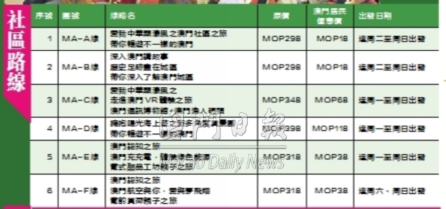 黃輝介紹,該十五條旅遊路線主要分為社區(qū)路線和休閒路線兩部分,出發(fā)地點(diǎn)安排在澳門(mén)的外港客運(yùn)港澳碼頭、氹仔北安碼頭。每位澳門(mén)居民可以優(yōu)惠的團(tuán)價(jià)分別參與一次社區(qū)路線遊及休閒路線遊,所有旅遊路線的本地居民優(yōu)惠價(jià)格由十八元到一百三十八元不等?;顒?dòng)已吸引合共一百四十八家澳門(mén)旅行社、約七百五十名導(dǎo)遊、逾五百臺(tái)旅遊大巴和五百位旅遊巴司機(jī),以及逾七百名前線旅遊從業(yè)人員參與,預(yù)計(jì)屆時(shí)將帶動(dòng)四十萬(wàn)人次參與活動(dòng)。