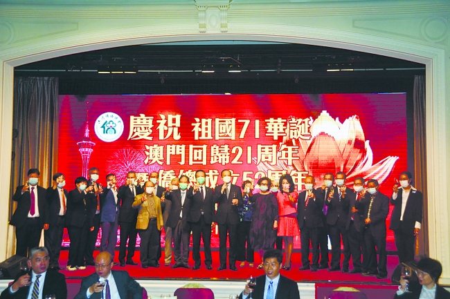 歸僑總會昨日舉行慶祝中華人民共和國成立七十一周年、澳門回歸祖國二十一周年暨僑總成立五十二周年聯(lián)歡聚會,筵開五十五席。嘉賓、負責人與僑界社團代表、各地歸僑、僑眷同申慶祝,場面熱鬧。