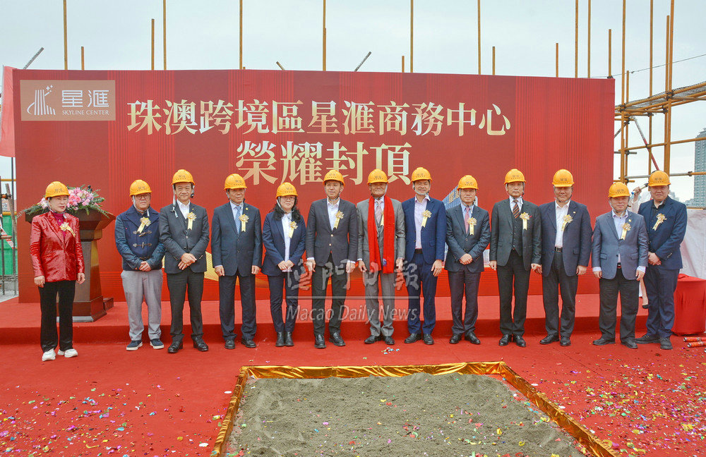 封頂儀式在星匯商務中心頂樓天臺舉行,鶴洲新區(qū)籌備組臨時黨委書記趙力、澳門貿(mào)促局主席余雨生、茂盛圍邊檢站站長李軼、澳門國際銀行董事長黃來志、中國土木工程集團執(zhí)行董事郁蔥、南光物流董事長張清、澳門創(chuàng)世集團董事長劉藝良、萬國集團董事長劉雅煌、澳門中西匯董事長馬志達、新大陸集團董事長劉金東、國基建設董事長丁曉平、珠海置信商業(yè)董事長蔡喆等嘉賓到賀,並共同為該中心揮鍬封頂。